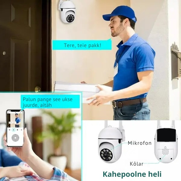 Välitingimustes kasutatavasse turvakaamerasse sisseehitatud tundliku mikrofoni abil saad kuulata ja rääkida meie rakenduse kaudu. Kahesuunaline heli võimaldab suhelda oodatud sõpradega ja liikumistuvastus võimaldab lahti saada soovimatutest külalistest või loomadest.