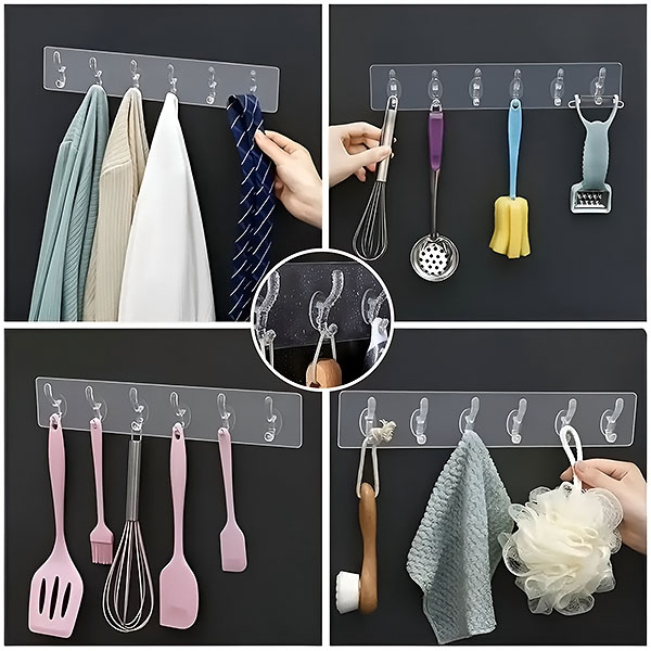 Muuda oma kodu korraldus selle paindliku isekleepuva riputuskonksu abil. Kuue tugeva konksuga sobib ideaalselt köögitööriistade, vannitoatarvikute, riiete ja muu sellise hoidmiseks.