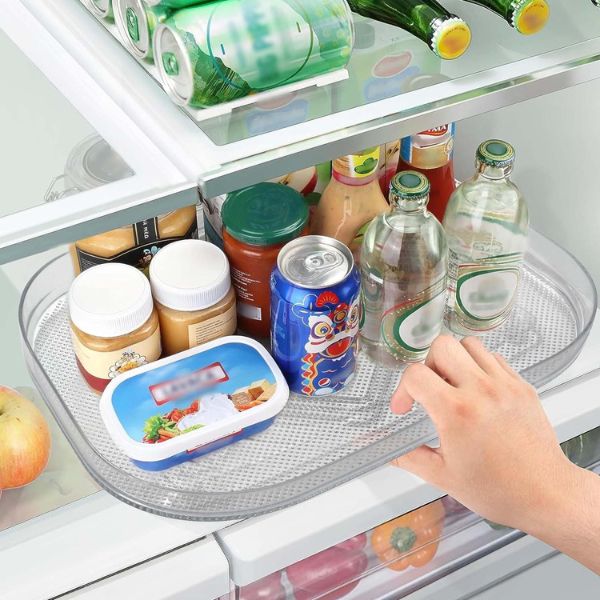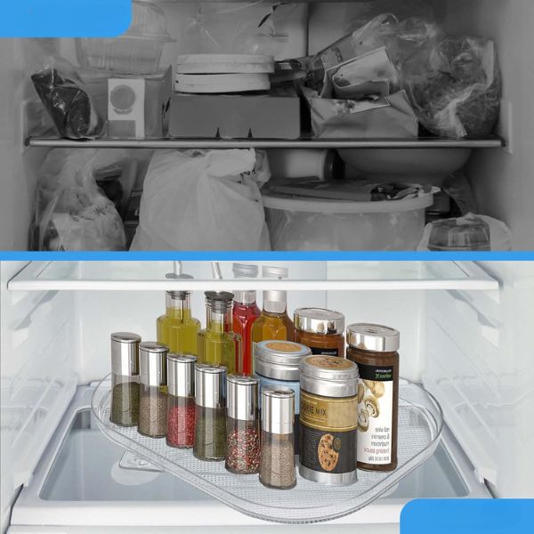 Hoidke oma külmkapp korralikult ja korras meie läbipaistva ristkülikukujulise külmkapi kandikuga. See 360° pöörlev külmkapi korraldaja on ideaalne lihtsa juurdepääsu ja maksimaalse ruumikasutuse jaoks. Seda on lihtne puhastada, sellel on libisemiskindlad iminapad ja see ei vaja paigaldamist.