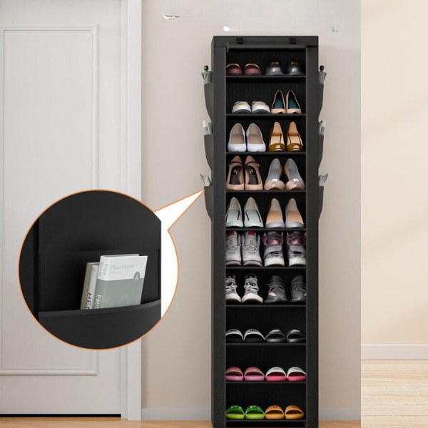 Varustatud tolmukindla kangast katte ja tõmblukuga. See jalanõude riiul tagab, et teie jalanõud püsivad puhtad, kaitstes neid tolmu ja mustuse eest.